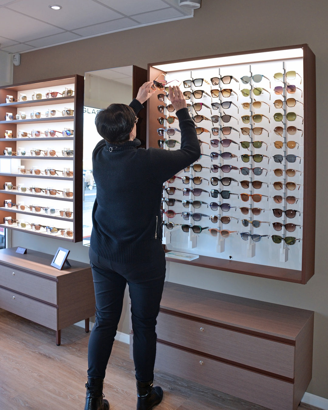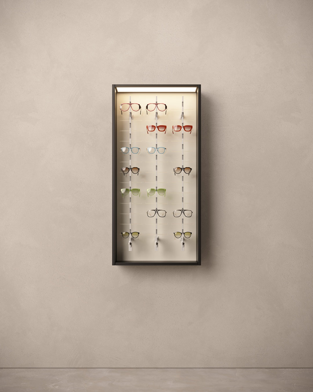 The Carré Alumina is a wall-mounted cabinet for sunglasses that combines high-capacity presentation with robust security, making it ideal for showcasing extensive (sun)glasses collections. Available in versions with a reliable key-lock mechanism or remote-control operation, these vertical optical store wall units ensure the safety of your frames while maintaining a refined appearance that complements any retail environment.