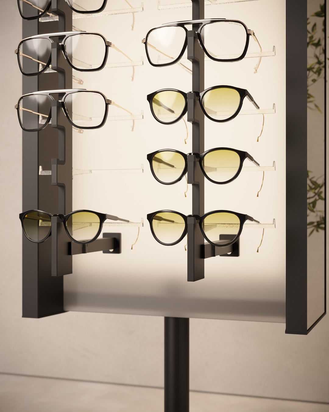 The Squarix LED-Display Open is a freestanding eyeglass display stand, double-sided and designed to maximise visibility while occupying minimal floor space. As a rotating sunglass display stand, its smooth-turning chassis allows effortless access to all 68 frames, enhancing the browsing experience for customers.